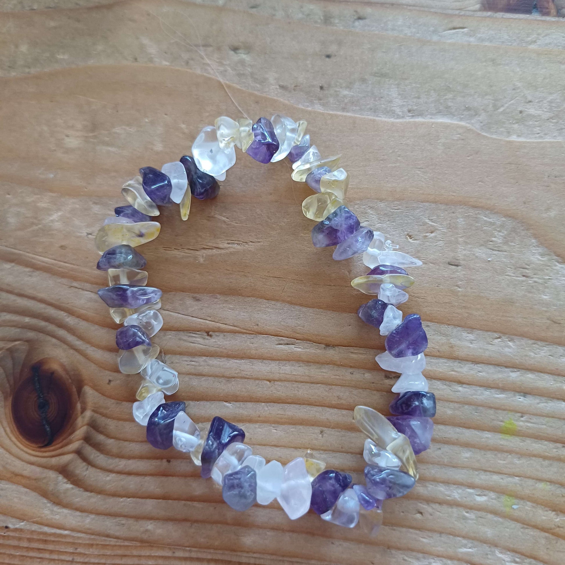 Elevate your spirit with this exquisite gemstone bracelet featuring amethyst, rose quartz, rock crystal, and citrine. Each stone brings its unique energy—amethyst for calm, rose quartz for love, rock crystal for clarity, and citrine for positivity. Wear it to inspire balance, harmony, and confidence in your daily life.